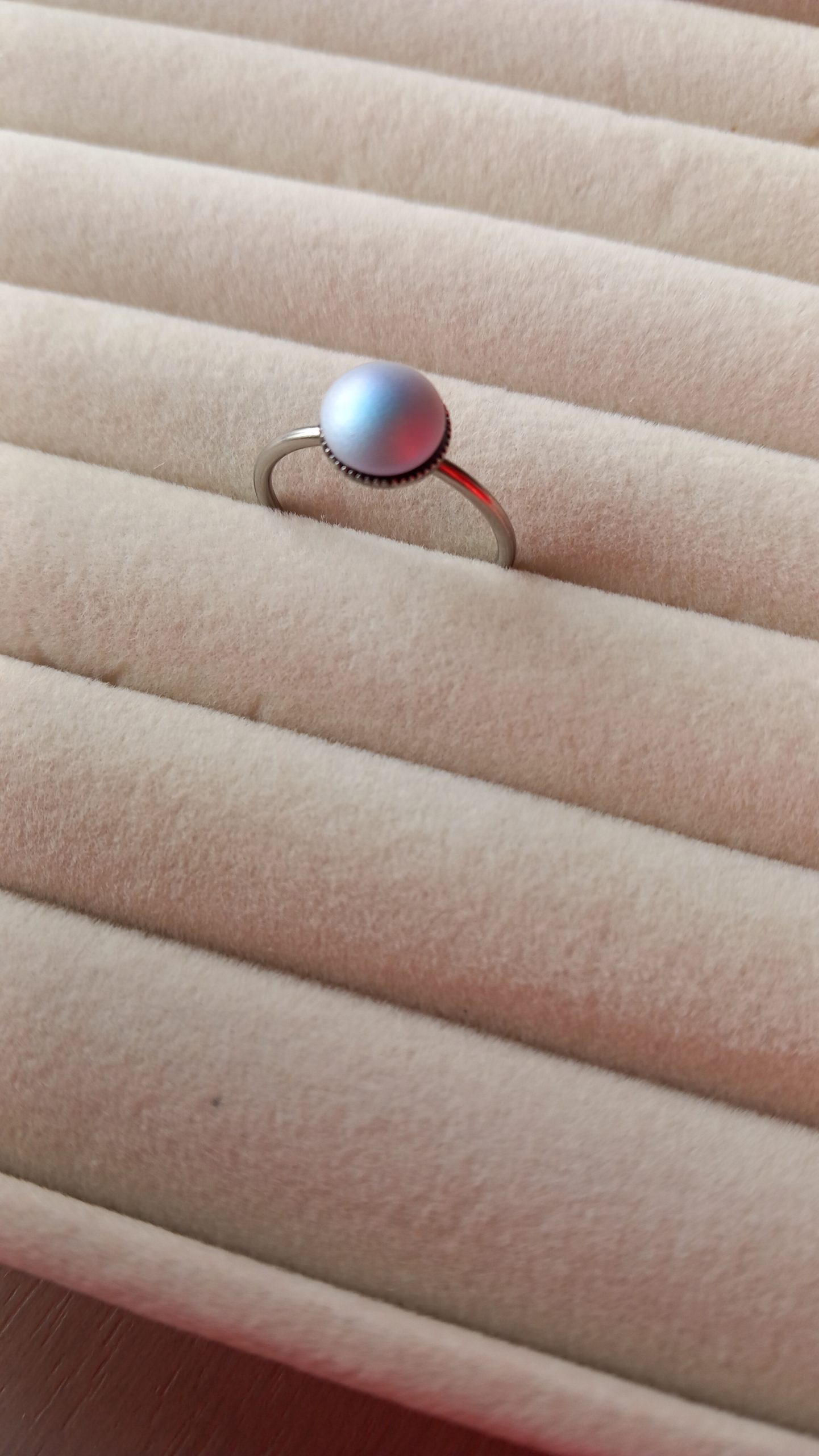 bague fine en acier inoxydable argentée avec une perle Puca nacrée en verre.
