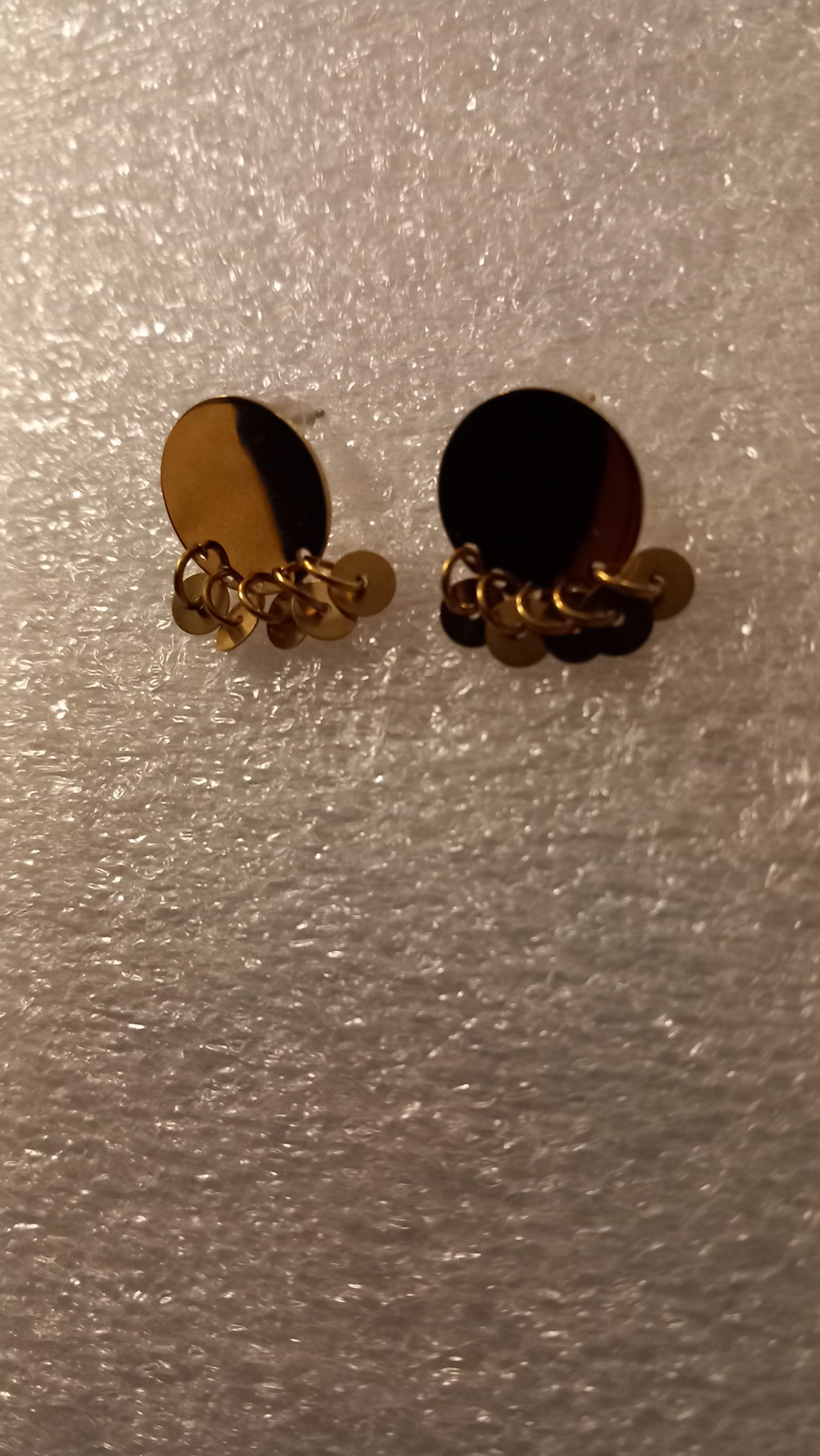 Boucles d’oreilles clous plates en acier inoxydable, et petits disques dorés en acier inoxydable.