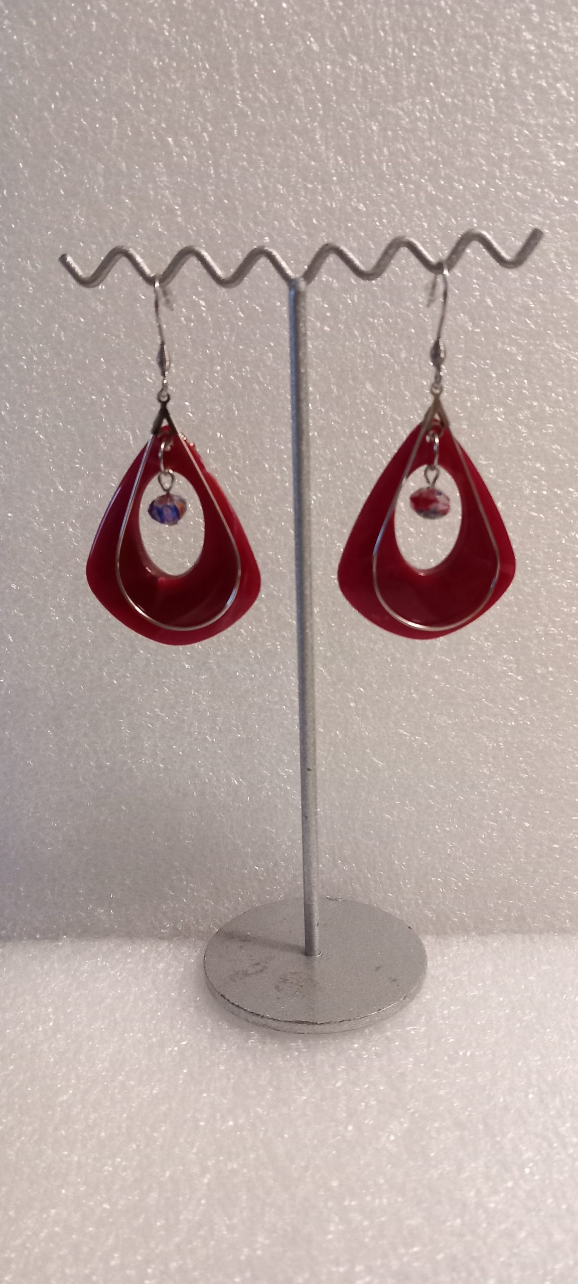 Boucles d’oreilles fabriquées avec des pendentifs en acétate, des pendentifs en acier inoxydable 316 ainsi que les anneaux et les crochets en acier inoxydables 316, avec des perles en verre.