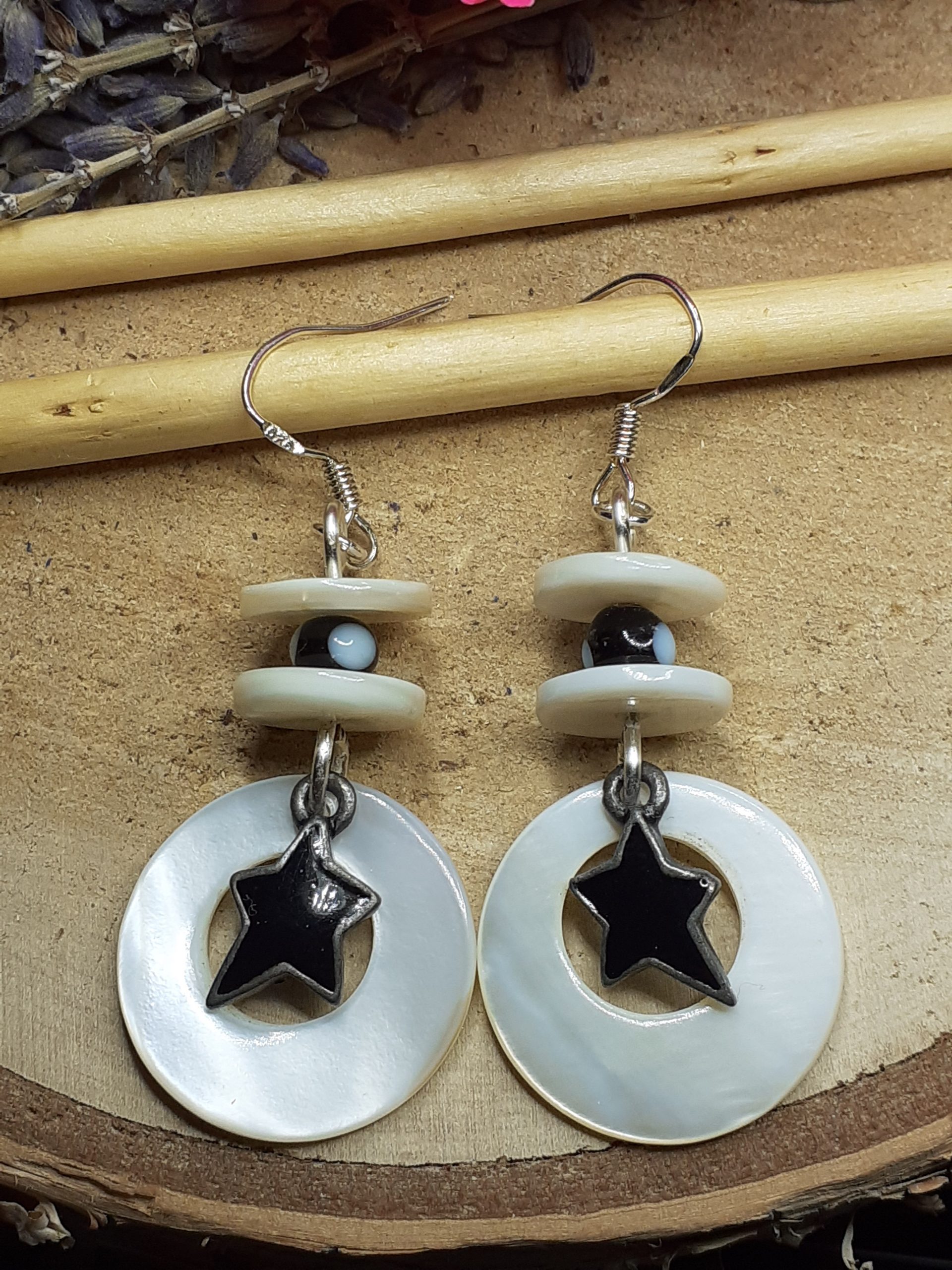 Boucles d’oreilles fabriquées avec des perles en nacre, perles en verre et petites breloques.