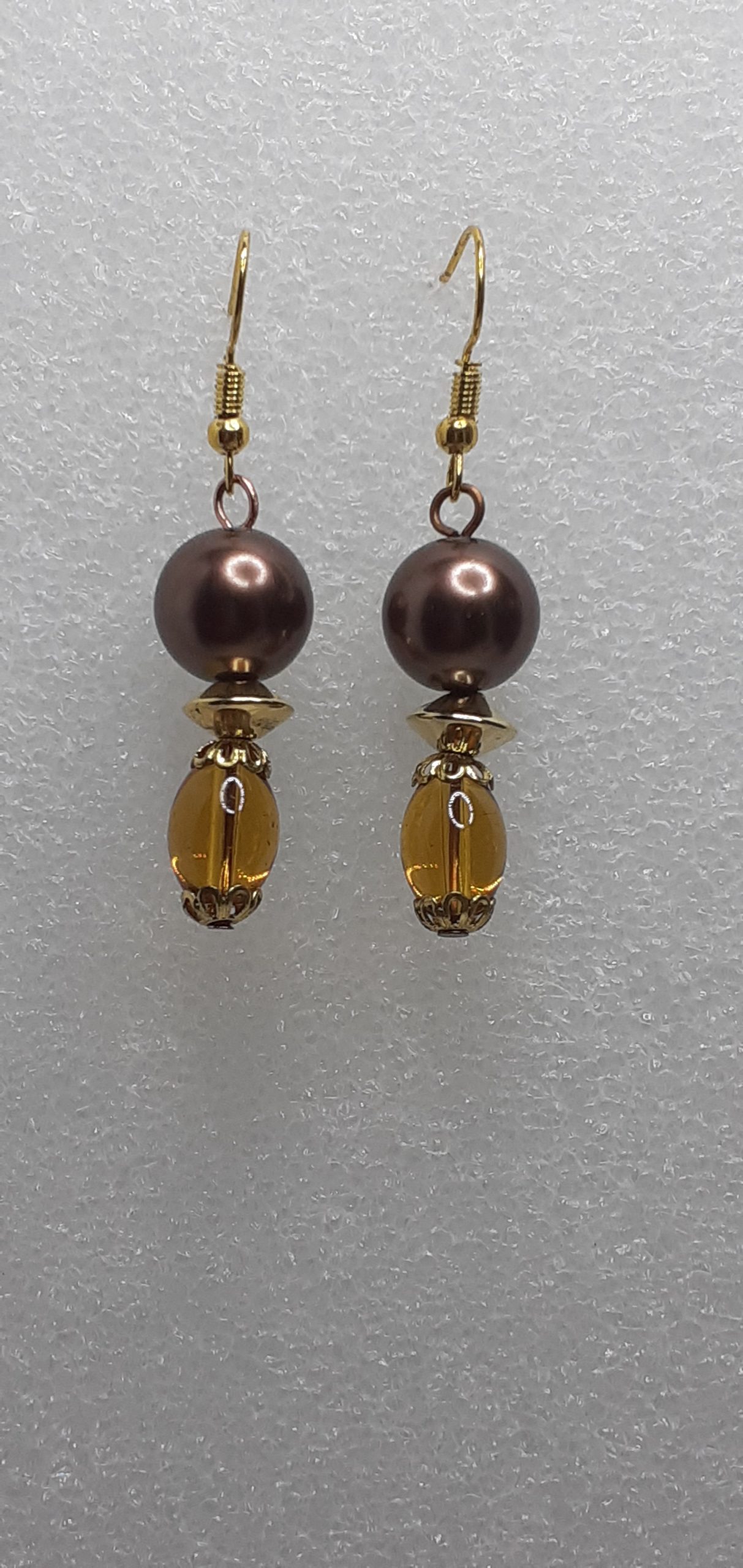Boucles d’oreilles fabriquées avec des perles nacrées en verre, des perles de quartz fumé et des séparateurs dorés.