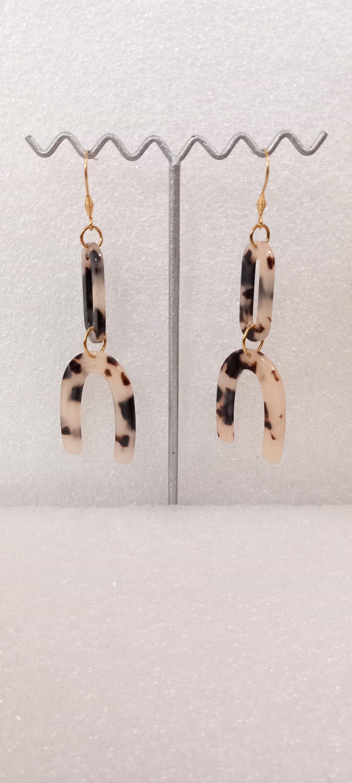Boucles d’oreilles vintage, fabriquées avec des pendentifs en acétate mouchetés marron, les anneaux et crochets en acier inoxydable dorés 316.