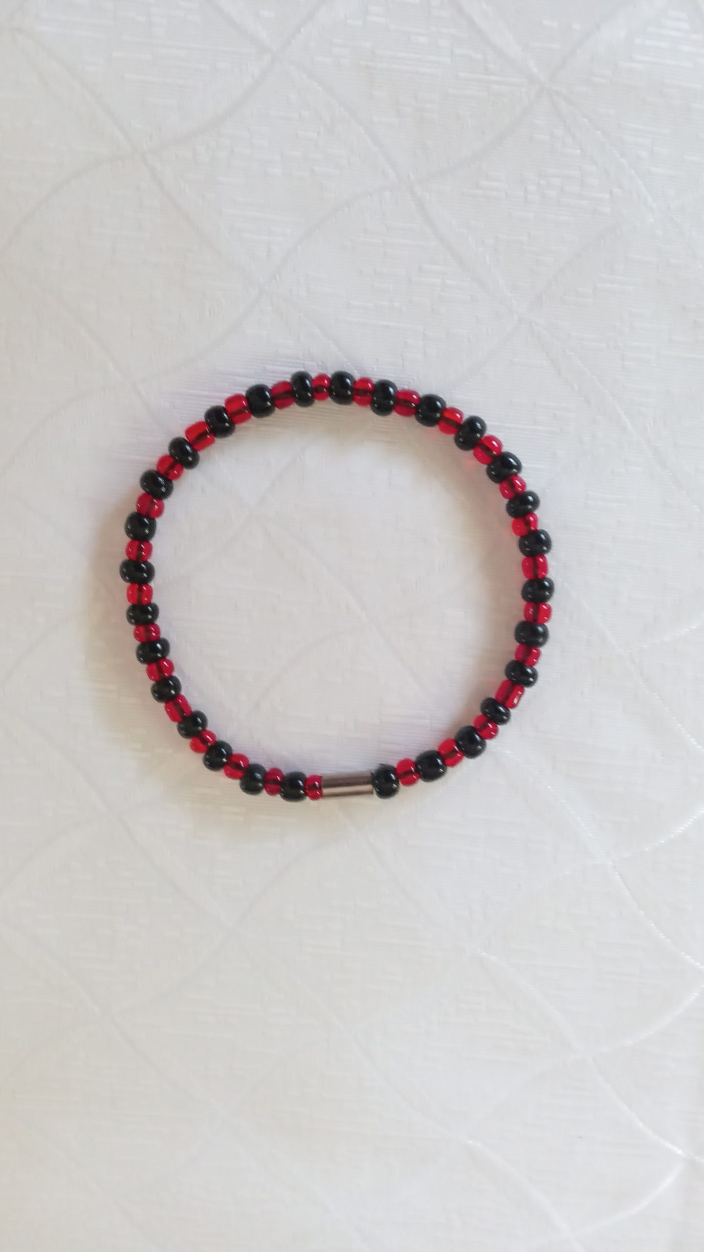 Bracelet fabriqué avec des petites perles de rocaille rouges et noires.