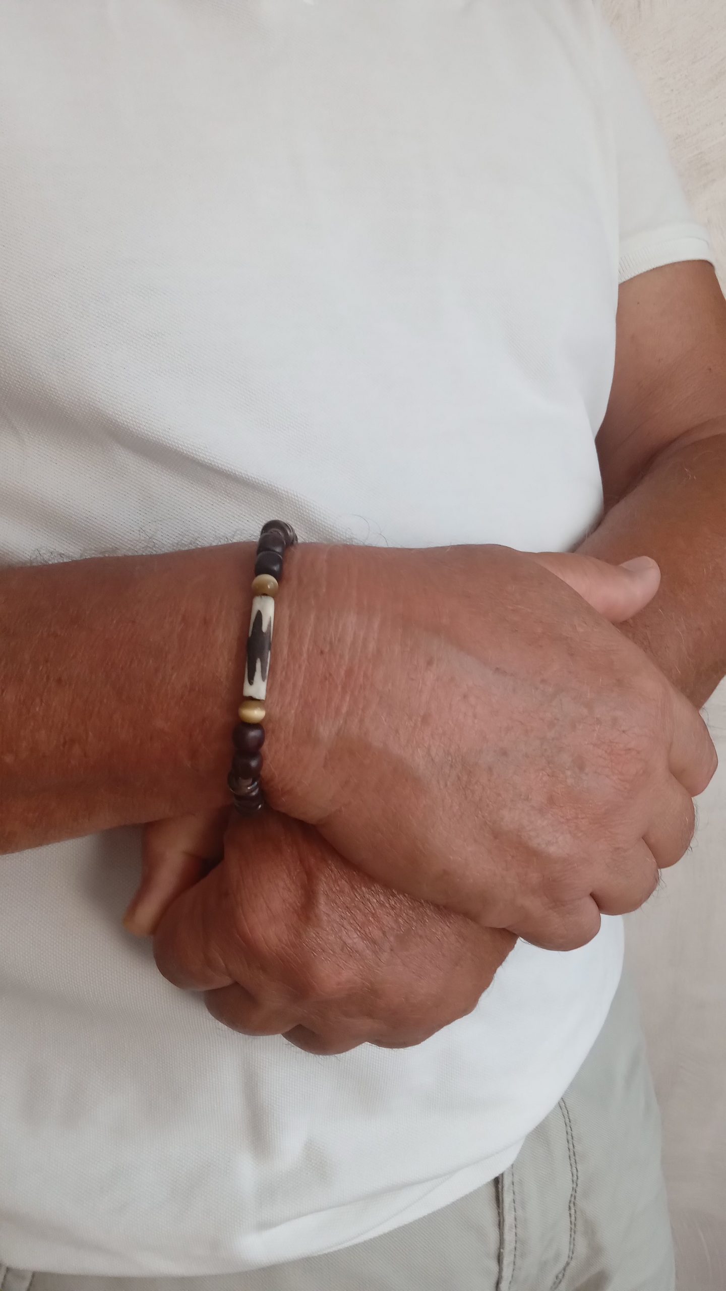 Bracelet homme, perles en bois, perles œil de chat avec une perle en céramique.