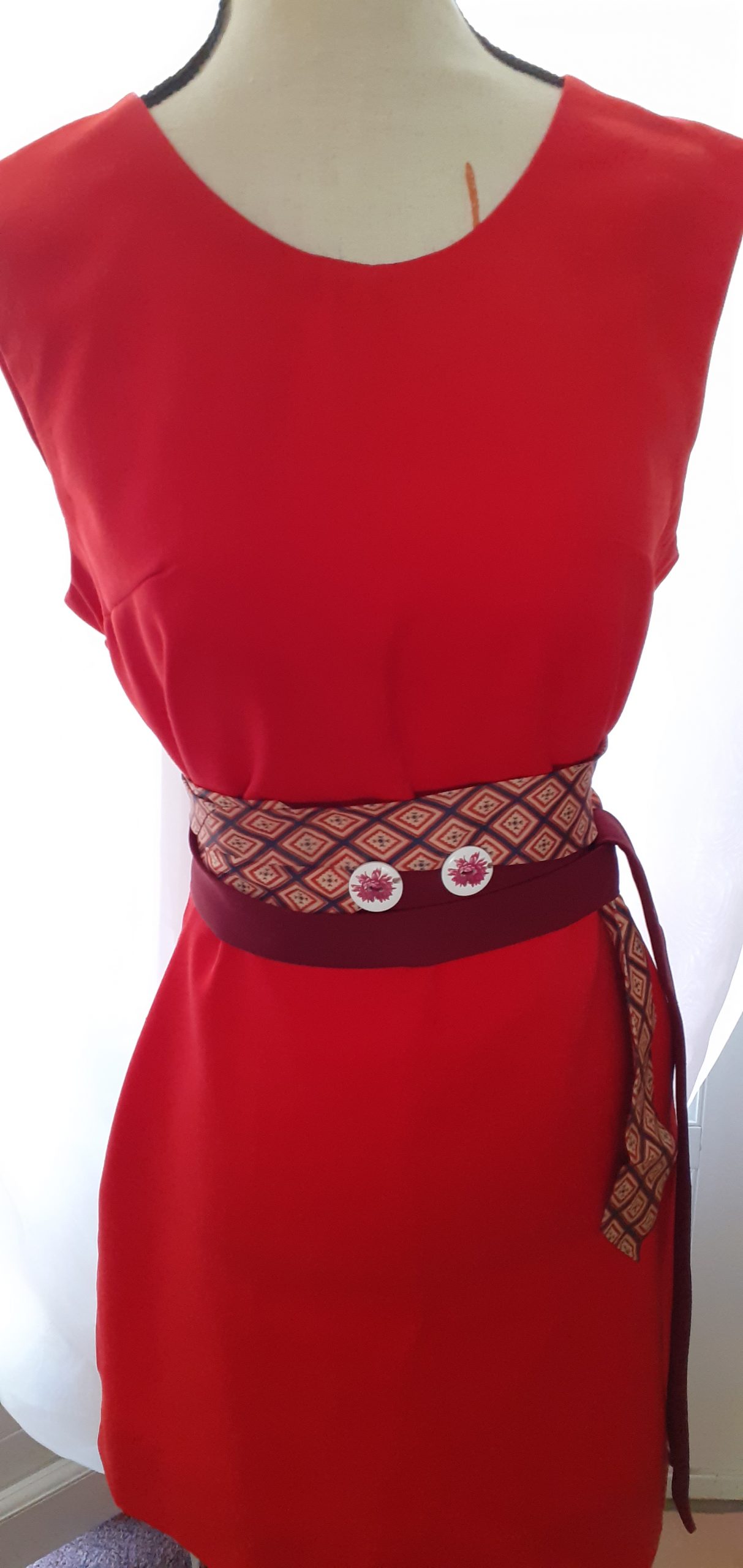 Ceinture fabriquée avec des cravates, une avec des carreaux et une bordeaux, avec des boutons en bois fleuri. S’attache avec un nœud sur le côté.