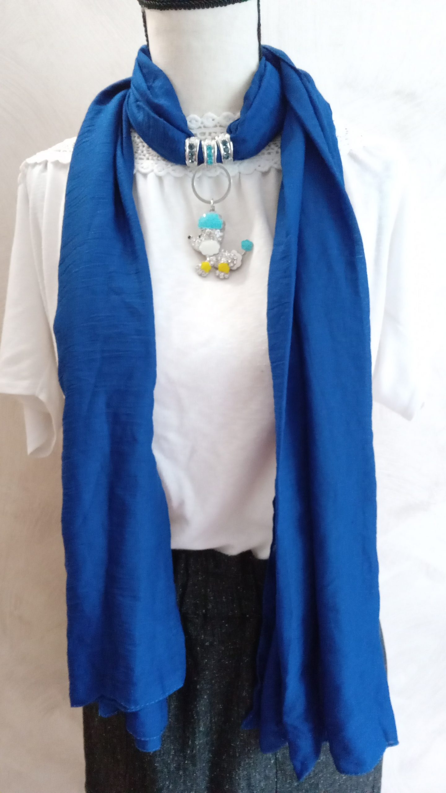 Foulard bijoux bleu, avec des anneaux argentés strass et pendentif chien en strass.