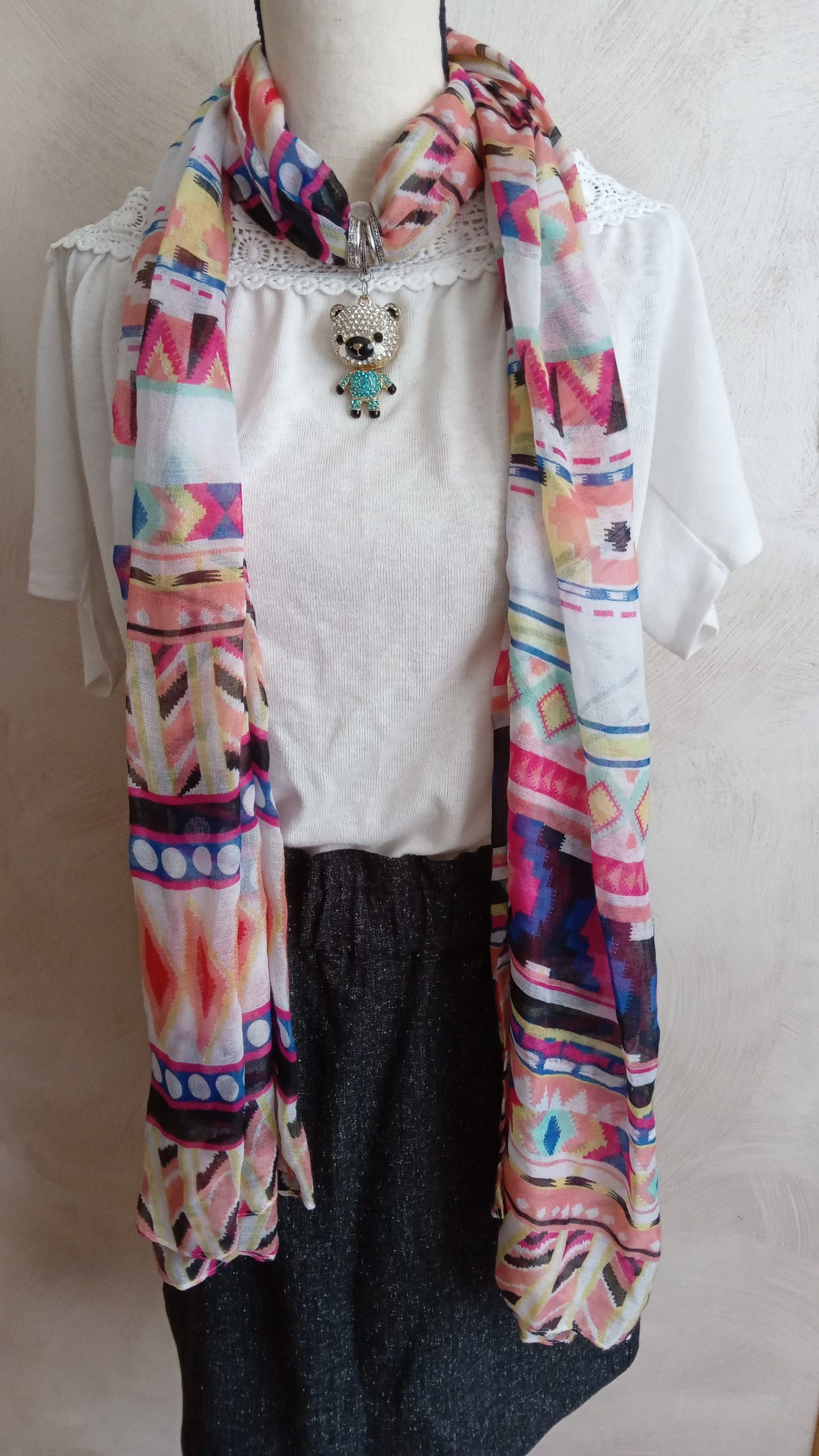 Foulard bijoux en couleurs avec des anneaux argentés et pendentif koala en strass.